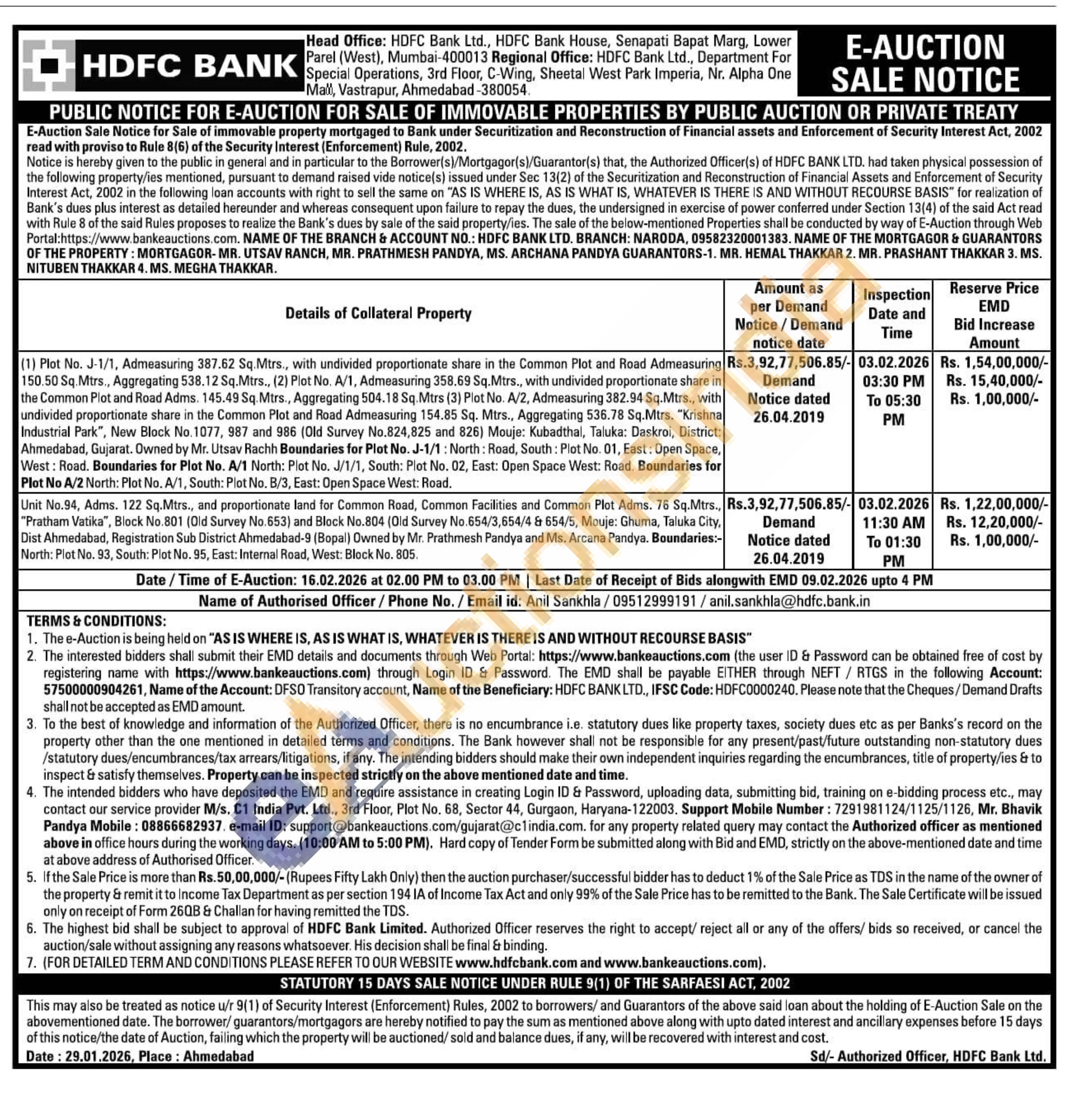 Unit No.94, Adms. 122 Sq.Mtrs., and proportionate land for Common Road, Common Facilities and Common Plot Adms. 76 Sq.Mtrs., "Pratham Vatika", Block No.801 (Old Survey No.653) and Block No.804 (Old Survey No.654/3,654/4 & 654/5, Mouje: Ghuma, Taluka City, Dist Ahmedabad, Registration Sub District Ahmedabad-9 (Bopal) Owned by Mr. Prathmesh Pandya and Ms. Arcana Pandya. Boundaries:-North: Plot No. 93, South: Plot No. 95, East: Internal Road, West: Block No. 805.
