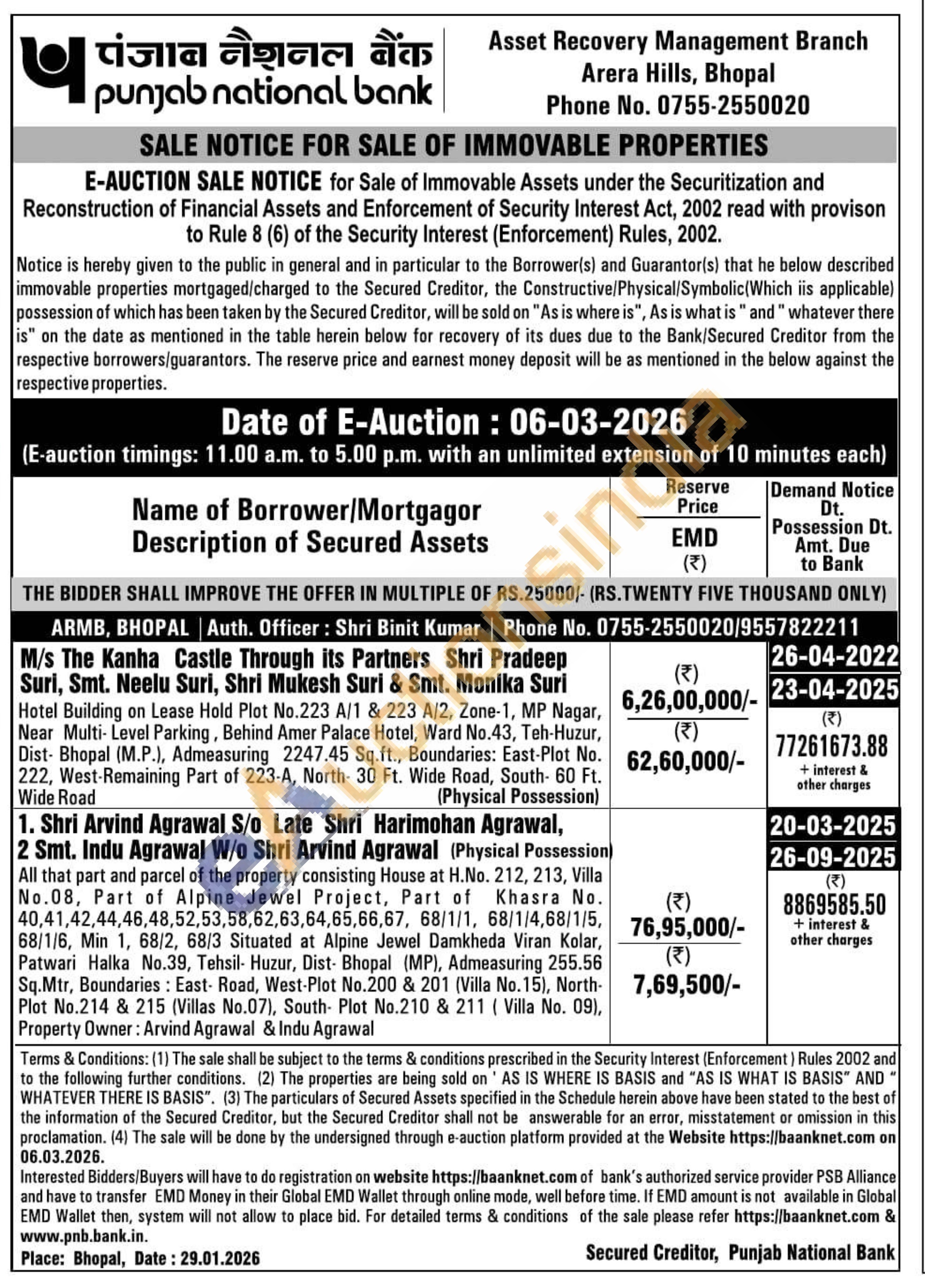 All that part and parcel of the property consisting House at H.No. 212, 213, Villa No.08, Part of Alpine Jewel Project, Part of Khasra No. 40,41,42,44,46,48,52,53,58,62,63,64,65,66,67, 68/1/1, 68/1/4,68/1/5, 68/1/6, Min 1, 68/2, 68/3 Situated at Alpine Jewel Damkheda Viran Kolar, Patwari Halka No.39, Tehsil Huzur, Dist-Bhopal (MP), Admeasuring 255.56 Sq.Mtr, Boundaries: East- Road, West-Plot No.200 & 201 (Villa No.15), North-Plot No.214 & 215 (Villas No.07), South Plot No.210 & 211 (Villa No. 09), Property Owner: Arvind Agrawal & Indu Agrawal