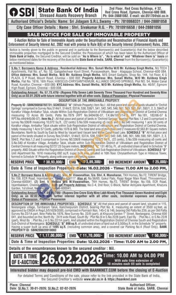 Property ID: SBIN200050702731: SCHEDULE "A" (Whole Property) Item No.: All that piece and parcel of lands situated in "Orchid Springs comprised in Survey Nos 514A/1,514A/2, 537/A, 538, 538/1, 541, 542, 545, 546, 561,589, 590,591, 592/1, 2, 3, 594/2 of Korattur Village Ambattur Taluk, situate Within Sub-Registration District of Villivakkam and Registration District of Central Chennai measuring 13 Acres 89 Cents. Patta No.7879 (RPT No.9404/06-07, Τ.Κ.8A/1873/1415, RPT No. 181, 182/06-07 & RPT.No.444/445/06-07). Item No.2: All that piece and parcel of lands in "Orchind Springs bearing Plot Nos. 1.2 and 3 comprised in survey No.536/B measuring 10,072 Sq. ft., (22 cents) S.No.539 measuring 05 cents and S.No 540 measuring 1 acre 30 cents of Korattur village, Ambattur Taluk situate within Sub-Registration District of villivakkam and Registration District of Central Chennai, totally measuring 1 Acre 57 Cents, patta No.1076 & 903. The total land area of item Nos.) and 2 measures 62,563.81 Square meters Boundaries: North by South by East by West by Vacant land Vacant land Water Canal Road Lake SCHEDULE "B" All that piece and parcel of the lands situated in Survey Nos 514A/1, 514A/2, 537/A, 538, 538/1, 541, 542, 545, 546, 561, 589, 590, 501, 592/1, 2, 3, 594/2, Plot Nos 1,2 and 3 comprised In Survey NO.536/8 measuring 10,072 Sq.ft., (22 cents), S.No. 539 measuring 05 cents and S.No.540 of Korattur Village, Ambattur Taluk, situate within Sub-Registration District of Vilivakkan and Registration District of Central Chennai in all measuring 52727.23 Square meters, SCHEDULE "C" 131.48 Sq. Ft, of undivided share of land in Schedule "B" property. AND Situate within the Registration District of Chennai Central and Sub Registration District of Villivakkam, SCHEDULE "D" Unit /Apartment No. 1616 measuring 692 sq.ft. super built area, situated in 16th floor. Chrysanthemum Type in Hibiscus Tower, formed in Schedule "A" Property, along with one open car Parking space.