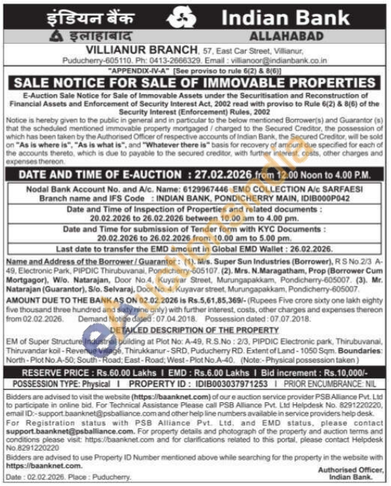 EM of Super Structure Industrial building at Plot No: A-49, R.S.No: 2/3, PIPDIC Electronic park, Thirubuvanai, Thiruvandar koil-Revenue Village, Thirukkanur-SRD, Puducherry RD. Extent of Land-1050 Sqm. Boundaries: North-Plot No.A-50, South-Road, East-Road, West-Plot No.A-40. (Note:-Physical possession taken)