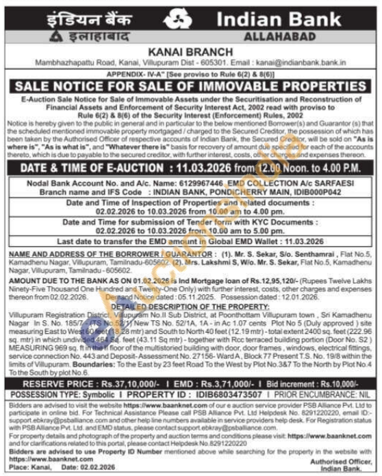 DETAILED DESCRIPTION OF THE PROPERTY: Villupuram Registration District, Villupuram No.Il Sub District, at Poonthottam Villupuram town, Sri Kamadhenu Nagar In S. No. 185/7 (TS No.52/1) New TS No. 52/1A, 1A-in Ac 1.07 cents Plot No 5 (Duly approved) site measuring East to West 60 feet (18.28 mtr) and South to North 40 feet (12.19 mtr)-total extent 2400 sq feet (222.96 sq. mtr) in which undivided 464 Sq. feet (43.11 Sq mtr)-together with Roc terraced building portion (Door No. 82) MEASURING 969 sq. ft in the Il floor of the multistoried building with door, door frames, windows, electrical fittings, service connection No. 443 and Deposit-Assessment No. 27156-WardA, Block 77 Present T.S. No. 19/8 within the limits of Villupuram, Boundaries: To the East by 23 feet Road To the West by Plot No.387 To the North by Plot No. 4 To the South by plot No.6