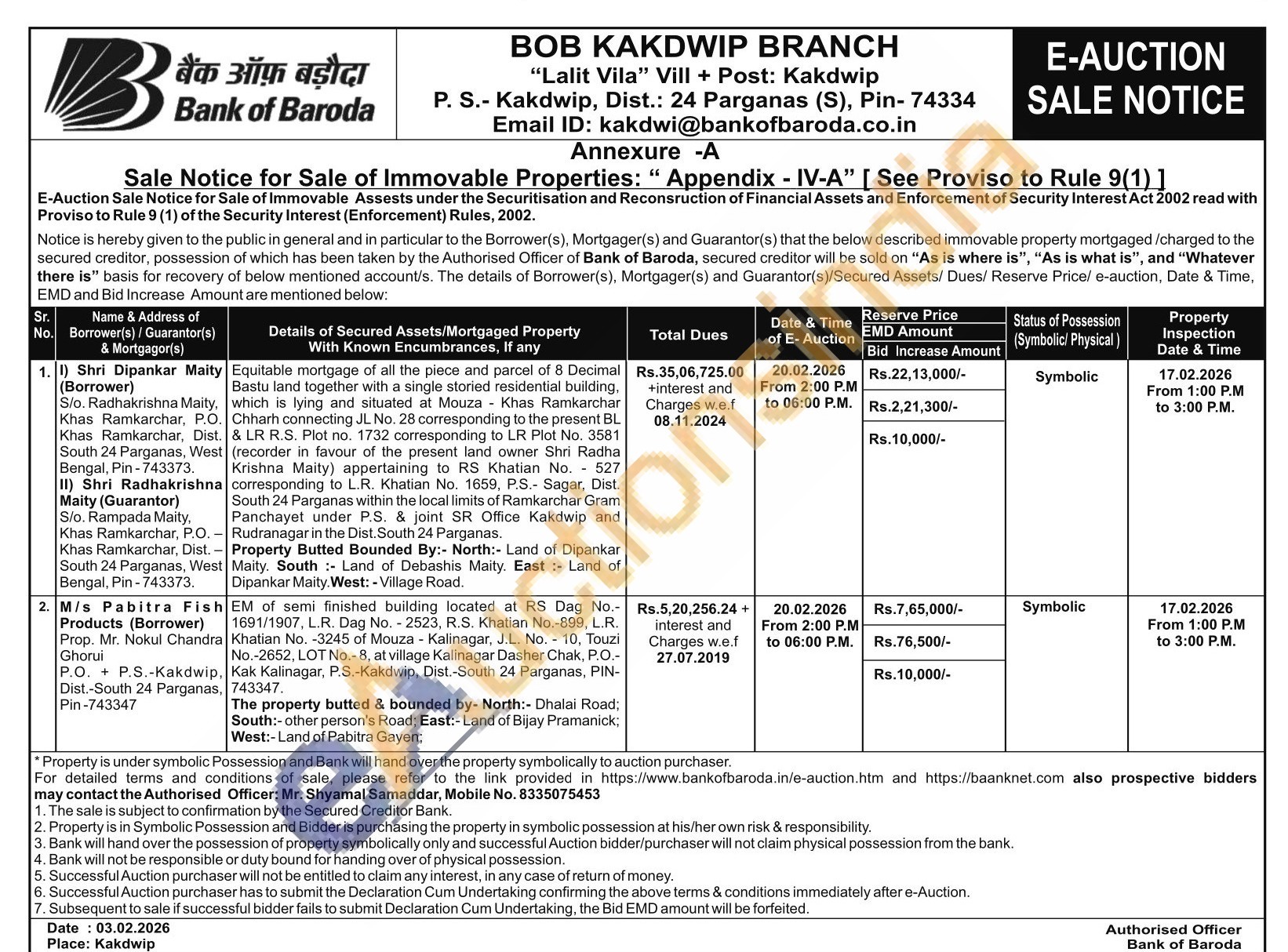 EM of semi finished building located at RS Dag No.-1691/1907, L.R. Dag No. 2523, R.S. Khatian No.-899, L.R. Khatian No. -3245 of Mouza Kalinagar, J.L. No. 10, Touzi No.-2652, LOT No.- 8, at village Kalinagar Dasher Chak, P.O.-Kak Kalinagar, P.S.-Kakdwip, Dist.-South 24 Parganas, PIN-743347.The property butted & bounded by- North:- Dhalai Road; South: other person's Road; East:-Land of Bijay Pramanick; West:-Land of Pabitra Gayen;
