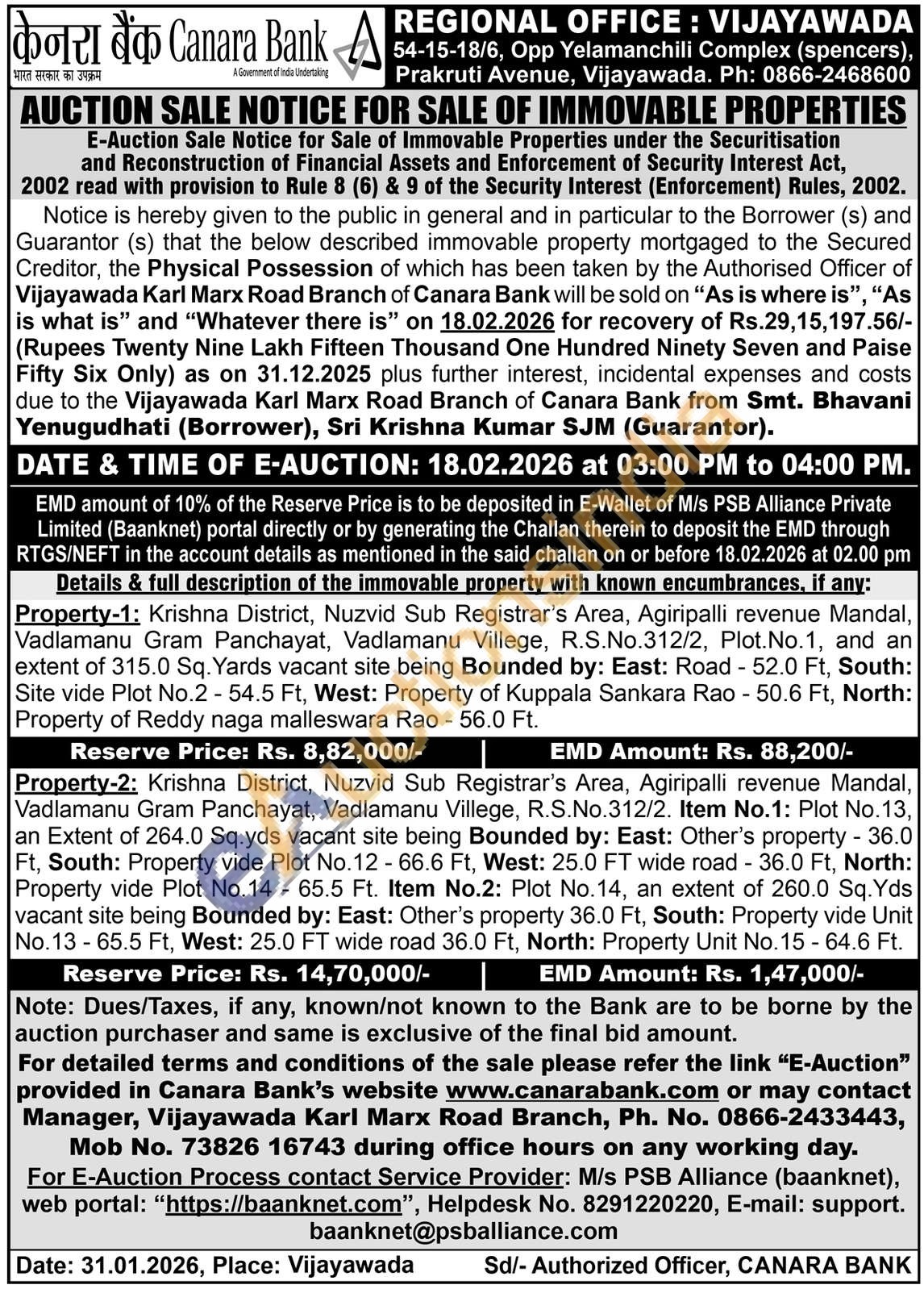 Property-2: Krishna District, Nuzvid Sub Registrar's Area, Agiripalli revenue Mandal, Vadlamanu Gram Panchayat, Vadlamanu Villege, R.S.No.312/2. Item No.1: Plot No.13, an Extent of 264.0 Sq.yds vacant site being Bounded by: East: Other's property - 36.0 Ft, South: Property vide Plot No.12 - 66.6 Ft, West: 25.0 FT wide road - 36.0 Ft, North: Property vide Plot No.14 65.5 Ft. Item No.2: Plot No.14, an extent of 260.0 Sq. Yds vacant site being Bounded by: East: Other's property 36.0 Ft, South: Property vide Unit No.13-65.5 Ft, West: 25.0 FT wide road 36.0 Ft, North: Property Unit No.15 - 64.6 Ft.