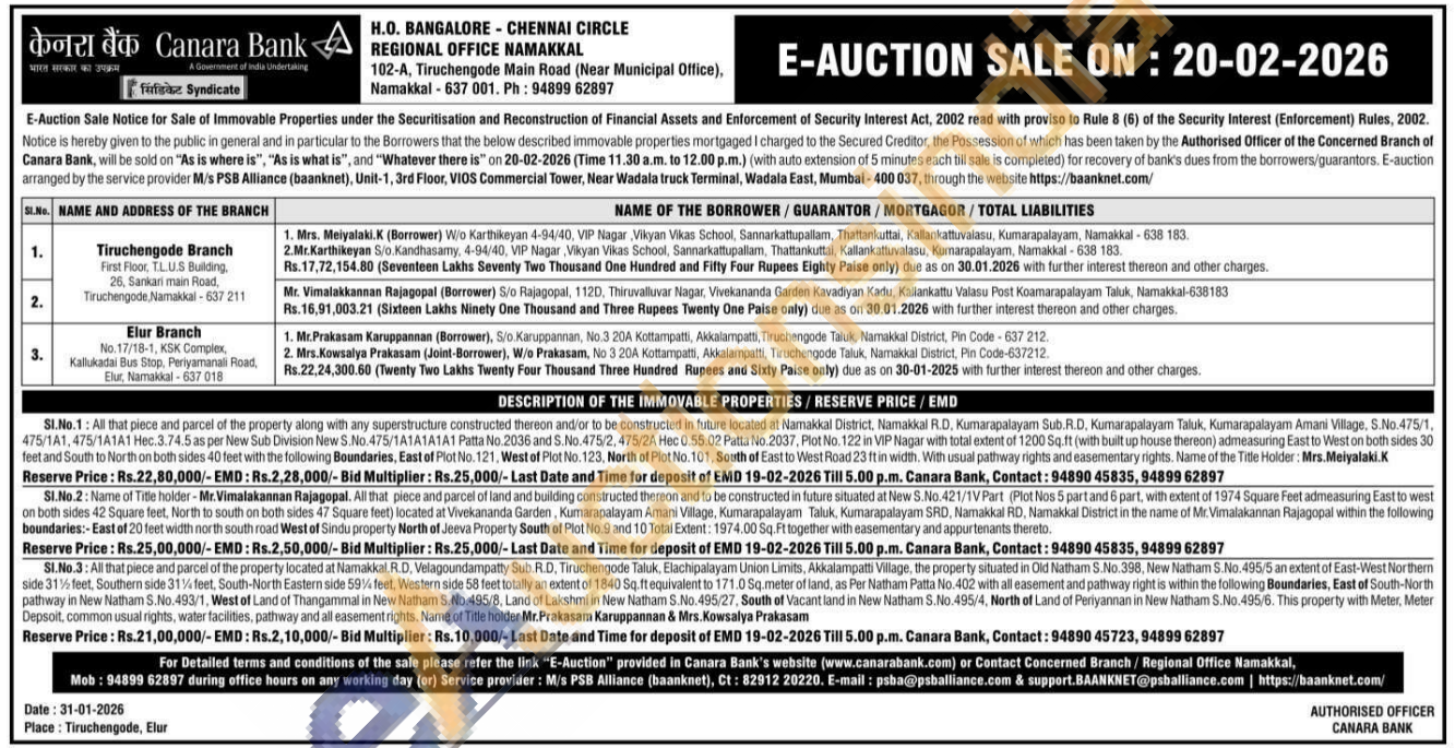 S1.No.3: All that piece and parcel of the property located at Namakkal.R. D. Velagoundampatty Sub. R.D, Tiruchengode Taluk, Elachipalayam Union Limits, Akkalampatti Village, the property situated in Old Natham S.No.398, New Natham S.No. 495/5 an extent of East-West Northern side 31 1/2feet, Southern side 31 1/4feet, South-North Eastern side 59 1/4 feet, Western side 58 feet totally an extent of 1840 Sq.ft equivalent to 171.05q meter of land, as Per Natham Patta No.402 with all easement and pathway right is within the following Boundaries, East of South-North pathway in New Natham S.No. 493/1, West of Land of Thangammal in New Natham S.No.495/8, Land of Lakshmi in New Natham S.No.495/27, South of Vacant land in New Natham S.No.495/4, North of Land of Periyannan in New Natham S.No. 495/6. This property with Meter, Meter Depsoit, common usual rights, water facilities, pathway and all easement rights. Name of Title holder Mr.Prakasam Karuppannan & Mrs. Kowsalya Prakasam