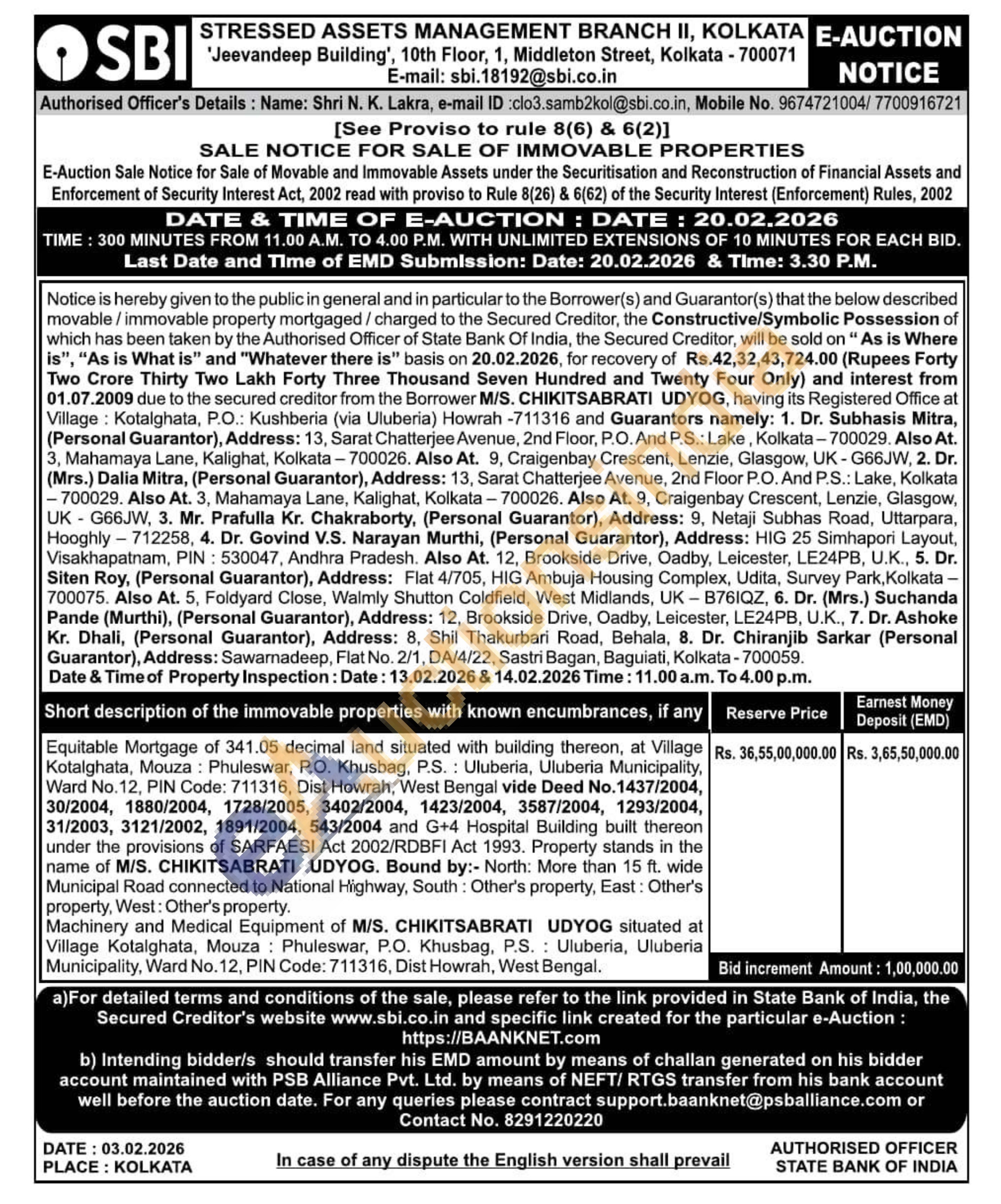 Equitable Mortgage of 341.05 decimal land situated with building thereon, at Village Kotalghata, Mouza: Phuleswar, P.O. Khusbag, P.S.: Uluberia, Uluberia Municipality, Ward No. 12, PIN Code: 711316, Dist Howrah, West Bengal vide Deed No.1437/2004, 30/2004, 1880/2004, 1728/2005, 3402/2004, 1423/2004, 3587/2004, 1293/2004, 31/2003, 3121/2002, 1891/2004, 543/2004 and G+4 Hospital Building built thereon under the provisions of SARFAESI Act 2002/RDBFI Act 1993. Property stands in the name of M/S. CHIKITSABRATI UDYOG. Bound by:- North: More than 15 ft. wide Municipal Road connected to National Highway, South: Other's property, East: Other's property, West: Other's property. Machinery and Medical Equipment of M/S. CHIKITSABRATI UDYOG situated at Village Kotalghata, Mouza Phuleswar, P.O. Khusbag, P.S. Uluberia, Uluberia Municipality, Ward No. 12, PIN Code: 711316, Dist Howrah, West Bengal.