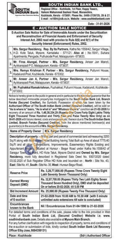 All that part and parcel of commercial land admeasuring 3200 Sq.Ft along with Multi-storied Hotel Building having Total Built up Area of about 7775.40 Sq.Ft and all other Constructions, Improvements, Easementary Rights Existing and Appurtenant thereon, Situated at Hunsur Begur Road under Katha No.1558/42 of Saragur Town, 1st Ward, HD Kote Taluk, Mysore District and Owned by Mis, Sargur Residency, more fully described in Registered Sale Deed No. 9307/2020 dated 03.02.2020 of Sub Registrar Office HD Kote and bounded on North Site No. 43, East: Site No. 41, South: Site No. 35, West: Hunsur-Begur Road