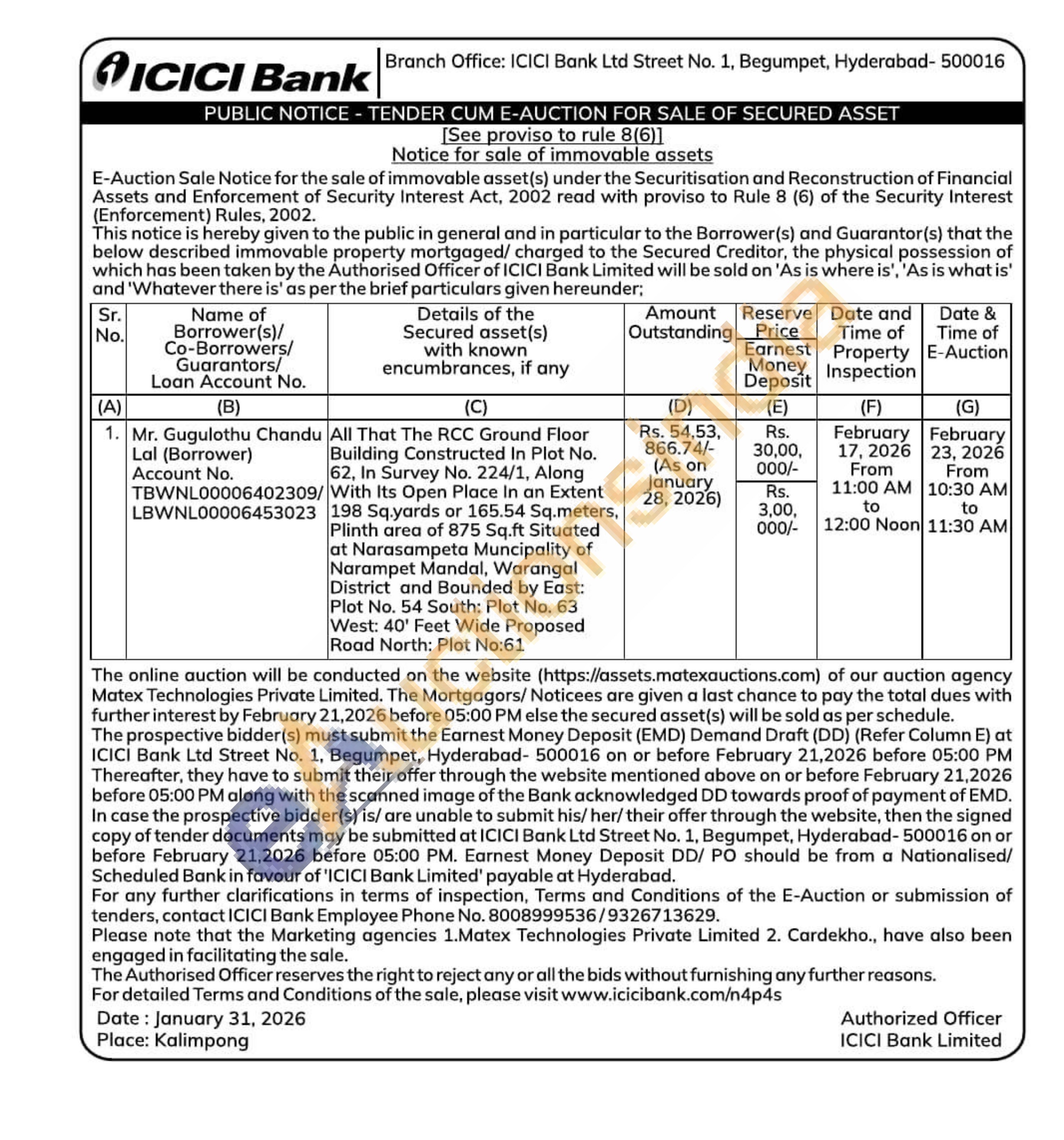 All That The RCC Ground Floor Building Constructed In Plot No. 62, In Survey No. 224/1, Along With Its Open Place In an Extent 198 Sq.yards or 165.54 Sq.meters, Plinth area of 875 Sq.ft Situated at Narasampeta Muncipality of Narasampet Mandal, Warangal District and Bounded by East: Plot No. 54 South: Plot No. 63 West: 40' Feet Wide Proposed Road North: Plot No:61