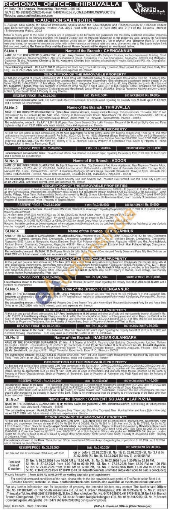 All that part and parcel of land admeasuring 6.07 Ares (equivalent to 15.00 centsi and other usufructs and improvements thereon situated in Re Sy No. 118/2/1 of Kurattissery village, Chengannur Taluk, within the Sub-Registration District of Chengannur and within Alappuzha District in the name of Smt.Susamma Varghese alias Susy Varghese vide Settlement Deed No. 394/2012 dated 08.03.2012 of SRO Mahnar and bounded on the North by Property of Varughese. East by Properly of Nedumthara, South by Property of Assise and West by Road