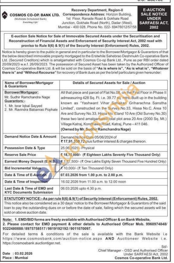 All that piece and parcel of Flat No.08, on the First Floor in Phase II admeasuring 428 Sq. Ft. ie. 39.77 sq. mtrs. Built up in the building known as "Yashwant Vihar Sahakari Griharachna Sanstha Limited", constructed on the Survey No.33, Hissa No.C. Area 10 Are and Survey No.33, Hissa No. Eland 10 Are (Old Survey No.30) these two land amalgamated total plot area 20 Are (2000 Sq. Mt.) Village Katraj, Kondhawa Road, Katraj, Pune-411046