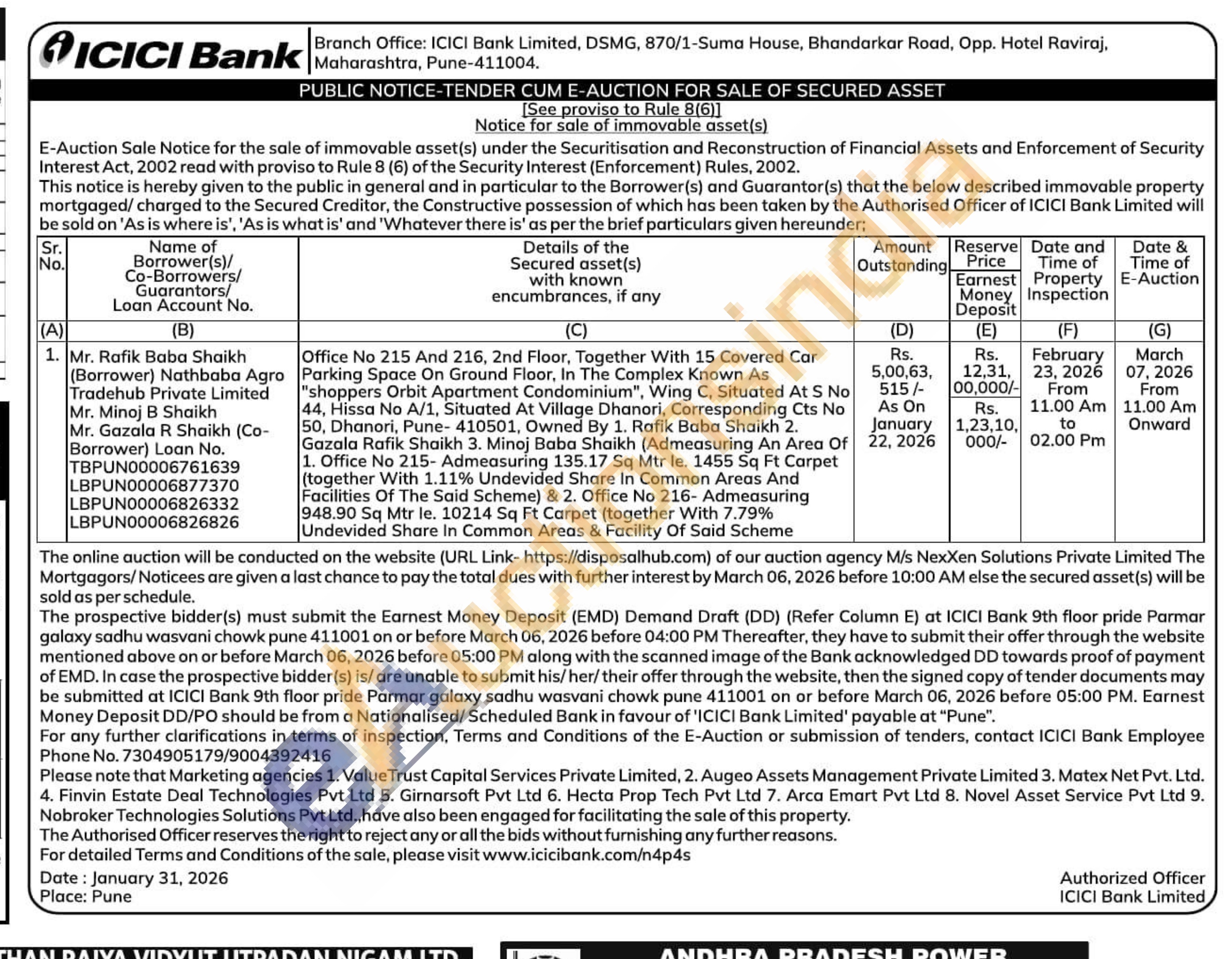 Office No 215 And 216, 2nd Floor, Together With 15 Covered Car Parking Space On Ground Floor, In The Complex Known As "shoppers Orbit Apartment Condominium", Wing C, Situated At S No 44, Hissa No A/1, Situated At Village Dhanori, Corresponding Cts No 50, Dhanori, Pune 410501, Owned By 1. Rafik Baba Shaikh 2. Gazala Rafik Shaikh 3. Minoj Baba Shaikh (Admeasuring An Area Of 1. Office No 215- Admeasuring 135.17 Sq Mtr le. 1455 Sq Ft Carpet (together With 1.11% Undevided Share In Common Areas And Facilities Of The Said Scheme) & 2. Office No 216- Admeasuring 948.90 Sq Mtr le. 10214 Sq Ft Carpet (together With 7.79% Undevided Share In Common Areas & Facility Of Said Scheme
