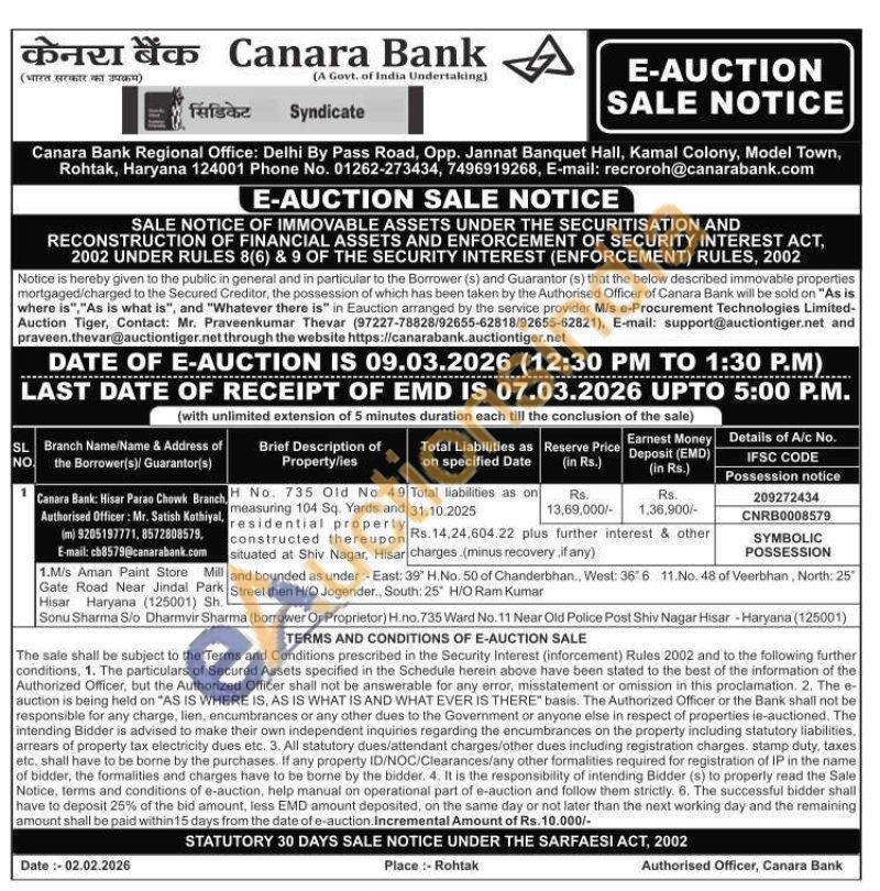 Η No. 735 Old No 49 measuring 104 Sq. Yards and residential property constructed thereupon situated at Shiv Nagar, Hisar and bounded as under:- East: 39" H.No. 50 of Chanderbhan., West: 366 11.No. 48 of Veerbhan, North: 25 Street then H/O Jogender, South: 25" H/O Ram Kumar