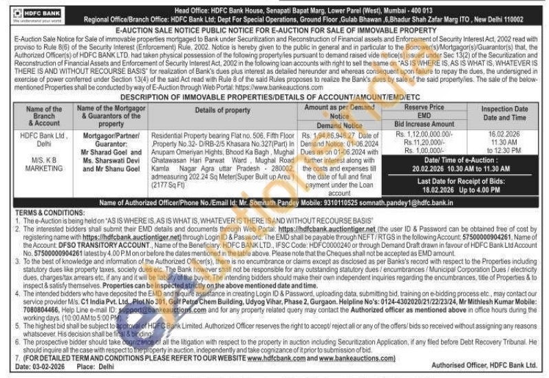 Residential Property bearing Flat no, 506, Fifth Floor Property No.32-D/RB-2/5 Khasara No. 327(Part) in Anupam Omeriyan Hights, Bhood Ka Bagh, Mughal Ghatawasan Hari Panwat Ward, Mughal Road Kamla Nagar Agra uttar Pradesh 280002, admeasuring 202.24 Sq Meter(Super Built up Area) (2177 Sq Ft)