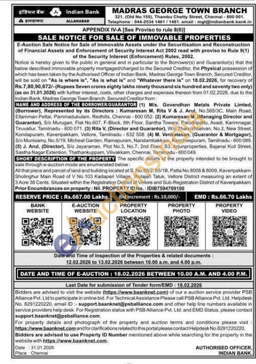 All that piece and parcel of land and building located at S. No. 85/2, 85/1B, Patta No.8008 & 8009, Kaveripakkam-Sholinghur Main Road of V No.103 Kadaperi Village, Walajah Taluk, Vellore District measuring an extent of 3 Acre 38 Cents. Situated within the Registration District of Vellore and Sub-Registration District of Kaveripakkam