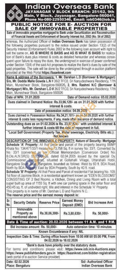 Schedule 'A' Property: All that piece and parcel of the property bearing BBMP Khata No: 134/471/33/1 measuring 73,758 Sq. ft in survey No. 33/1, Converted Sy No. 33/1 (converted as per Official Memorandum Conversion Order] No B. Dis.ALN.SR(S) 553/2004-05, dated 02.04.2005 issued by the special Dy Commissioner, Bangalore), situated at Gollahalli Village, Uttarahalli Hobli Bangalore. South Taluk, Bangalore, bounded as follows: West by 60 ft. BDA Road North by BDA Property, East by BDA Property, South by 40 ft road. Schedule 'B' Property: All that Piece and Parcel of residential Flat bearing No. 109. 1st floor of Jasmine Block, in a residential apartment known as "EDEN BLOSSOMS CONSISTING OF 2 Bed Rooms, a Kitchen, Dining and Living Room with a total super built-up area of 1155 Sq ft with one car parking space in the cellar floor and 450.45 sq. ft. of undivided night, title and interest in the Schedule 'A' Property. This property is in name of Mr. Darshan LD and Rashmi N. C.