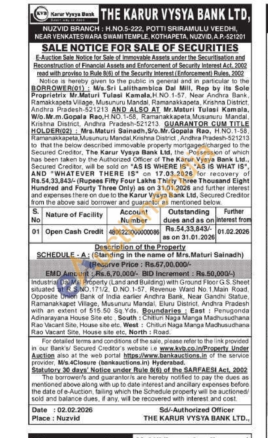 Industrial Dal Mill Property (Land and Building) with Ground Floor G.S. Sheet situated at R.S.NO.171/2, D.NO.1-57, Revenue Ward No. 1, Main Road, Opposite Union Bank of India earlier Andhra Bank, Near Gandhi Statue, Ramanakkapet Village, Musunuru Mandal, Eluru District, Andhra Pradesh with an extent of 515.50 Sq Yds, Boundaries: East: Penugonda Adinarayana House Site etc, South: Chitluri Naga Manga Madhusudhana Rao Vacant Site, House site etc, West: Chitluri Naga Manga Madhusudhana Rao Vacant Site, House site etc, North: Road.