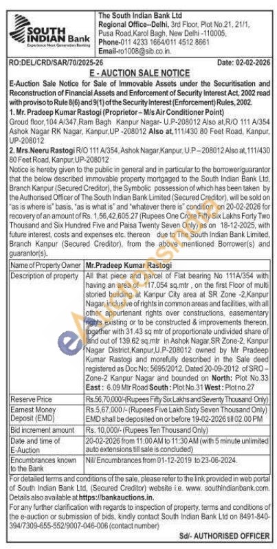 All that piece and parcel of Flat bearing No 111A/354 with having an area of 117.054 sq.mtr, on the first Floor of multi storied building at Kanpur City area at SR Zone -2 Kanpur Nagar, inclusive of rights in common areas and facilities, with all other appurtenant rights over constructions, easementary nights existing or to be constructed & improvements thereon. together with 31.43 sq mtr of proportionate undivided share of land out of 139.62 sq.mtr in Ashok Nagar, SR Zone-2, Kanpur Nagar District, Kanpur, U.P-208012 owned by Mr Pradeep Kumar Rastogi and morefully described in the Sale deed registered as Doc No: 5695/2012. Dated 20-09-2012 of SRO-Zone-2 Kanpur Nagar and bounded on North: Plot No.33 East: 6.09 Mir Road South: Plot No.31 West: Plot no.27