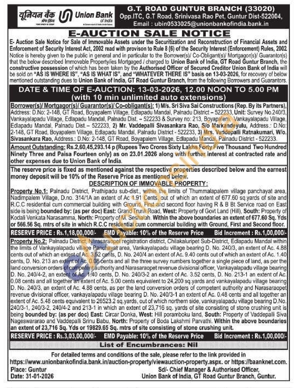 Palnadu District, Narasaraopet registration district, Chilakaluripet Sub-District, Edlapadu Mandal within the limits of Vankayalapadu village Panchayat area, Vankayalapadu village bearing D. No. 240/3, an extent of Ac. 4.88 cents out of which an extent of Ac. 3.52 cents, D. No. 240/4 an extent of Ac. 9.40 cents out of which an extent of Ac. 1.40 cents, D. No. 213 an extent of Ac. 0.08 cents and all the three survey numbers together a single piece of land, as per the land conversion orders of competent authority and Narasaraopet revenue divisional officer, Vankayalapadu village bearing D. No. 240/4-2, an extent of Ac. 1.40 cents, D. No. 240/3-2 an extent of Ac. 3.52 cents, D. No. 213-1 an extent of Ac. 0.08 cents and all together an extent of Ac. 5.00 cents equivalent to 24,200 sq yards and vankayalapadu village bearing D. No. 240/3, an extent of Ac. 4.88 cents, as per the land conversion orders of competent authority and Narasaraopet revenue divisional officer, vankayalapadu village bearing D. No. 240/3-1 an extent of Ac. 0.48 cents and all together an extent of Ac. 5.48 cents equivalent to 26523.2 sq.yards, out of which northern side, vankayalapadu village bearing D.No. 240/3-1, 240/3-2, 240/4-2 and 213-1 in which an extent of 23,716 sq. yards of site consisting of stone crushing unit is being bounded by: (as per doc) East: Circar Donka, West: Hill poramboku land, South: Property of Vaddepalli Siva Nageswararao and Vaddepalli Srinu Babu, North: Property of Boda Lakshmi Parvathi. Within the above boundaries an extent of 23,716 Sq. Yds or 19829.65 Sq. mtrs of site consisting of stone crushing unit
