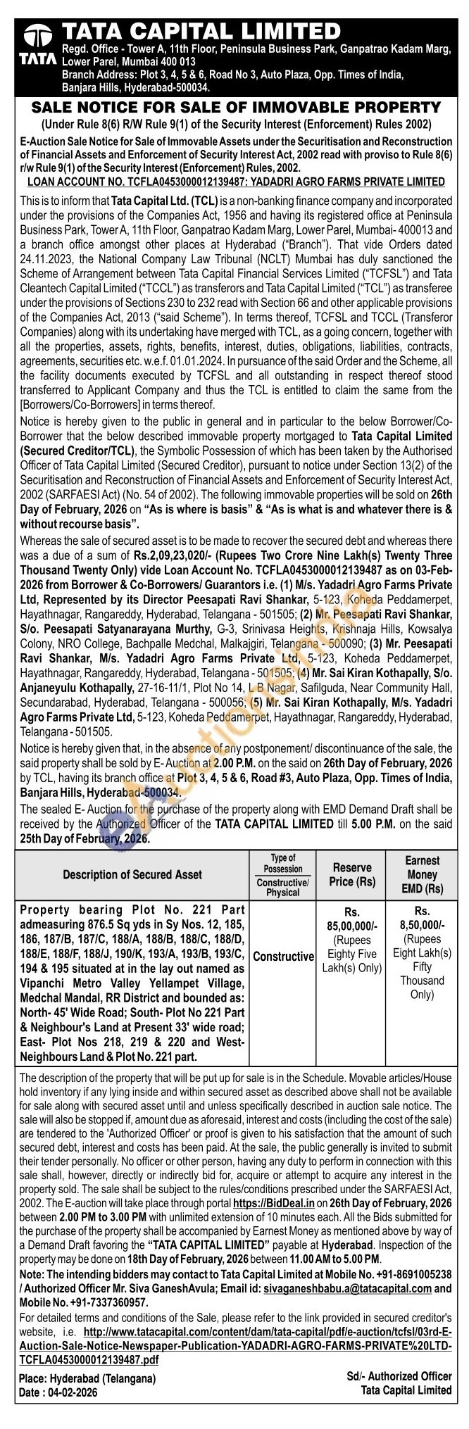 Property bearing Plot No. 221 Part admeasuring 876.5 Sq yds in Sy Nos. 12, 185, 186, 187/B, 187/C, 188/A, 188/B, 188/C, 188/D, 188/E, 188/F, 188/J, 190/K, 193/A, 193/B, 193/C, 194 & 195 situated at in the lay out named as Vipanchi Metro Valley Yellampet Village, Medchal Mandal, RR District and bounded as: North-45' Wide Road; South- Plot No 221 Part & Neighbour's Land at Present 33' wide road; East- Plot Nos 218, 219 & 220 and West-Neighbours Land & Plot No. 221 part