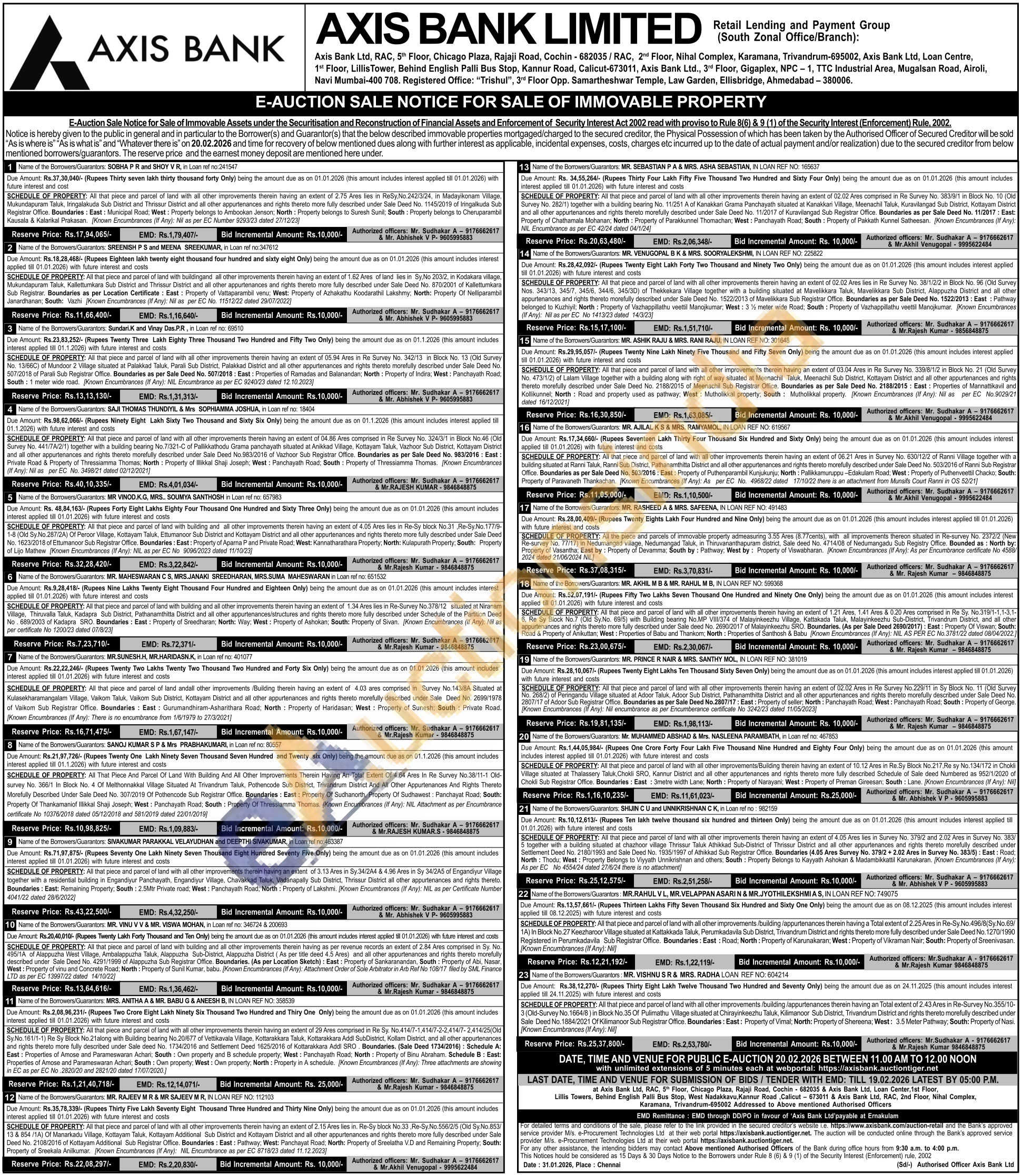 20) All that piece and parcel of land with all other improvements/Building therein having an extent of 10.12 Ares in Re.Sy Block No.217, Re sy No. 134/172 in Chokli Village situated at Thalassery Taluk, Chokli SRO, Kannur District and all other appurtenances and rights thereto more fully described Schedule of Sale deed Numbered as 952/1/2020 of Chokli Sub Registrar Office. Boundaries: East: 3metre width Lane; North: Property of Narayani; West: Property of Preman Gireesan; South: Lane. [Known Encumbrances (If Any): Nil]