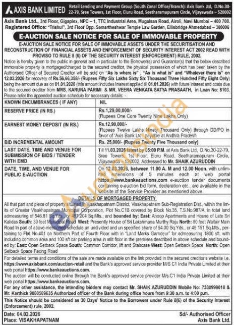 Description of the scheduled property as mentioned below : All that part and piece of property situated in Visakhapatnam District, Visakhapatnam Sub-Registration Dist, within the lim its of Greater Visakhapatnam Municipal Corporation, Plot No.C1B covered by Block No.35, T.5.No 9877A, in total land admeasuring of 546.81 Sq. Yds, or 457.204 Su Mts, and bounded by: East: Anoop Apartments and House of Late Sri Kalidas South: 30 feet Municipal Road West: Presently House of Sri Lakshmana Murthy Raju North: 80 feet Waltair Main Road in part of above-mentioned schedule an undivided and un specified share of 54.00 Sq. Yds, or 45.151 Sq.Mts, per taining to Flat No. 401 on Northem Part of Fourth Floor with in "Land Marks Gamdeur" for admeasuring 1800 sft. with including common area and 100 sft car parking area in stilt floor in the premises described in above schedule and bound-ed by: East: Open Setback Space South: Common Corridor, lift and Staircase West: Open Setback Space North: Open Setback Space Facing Road