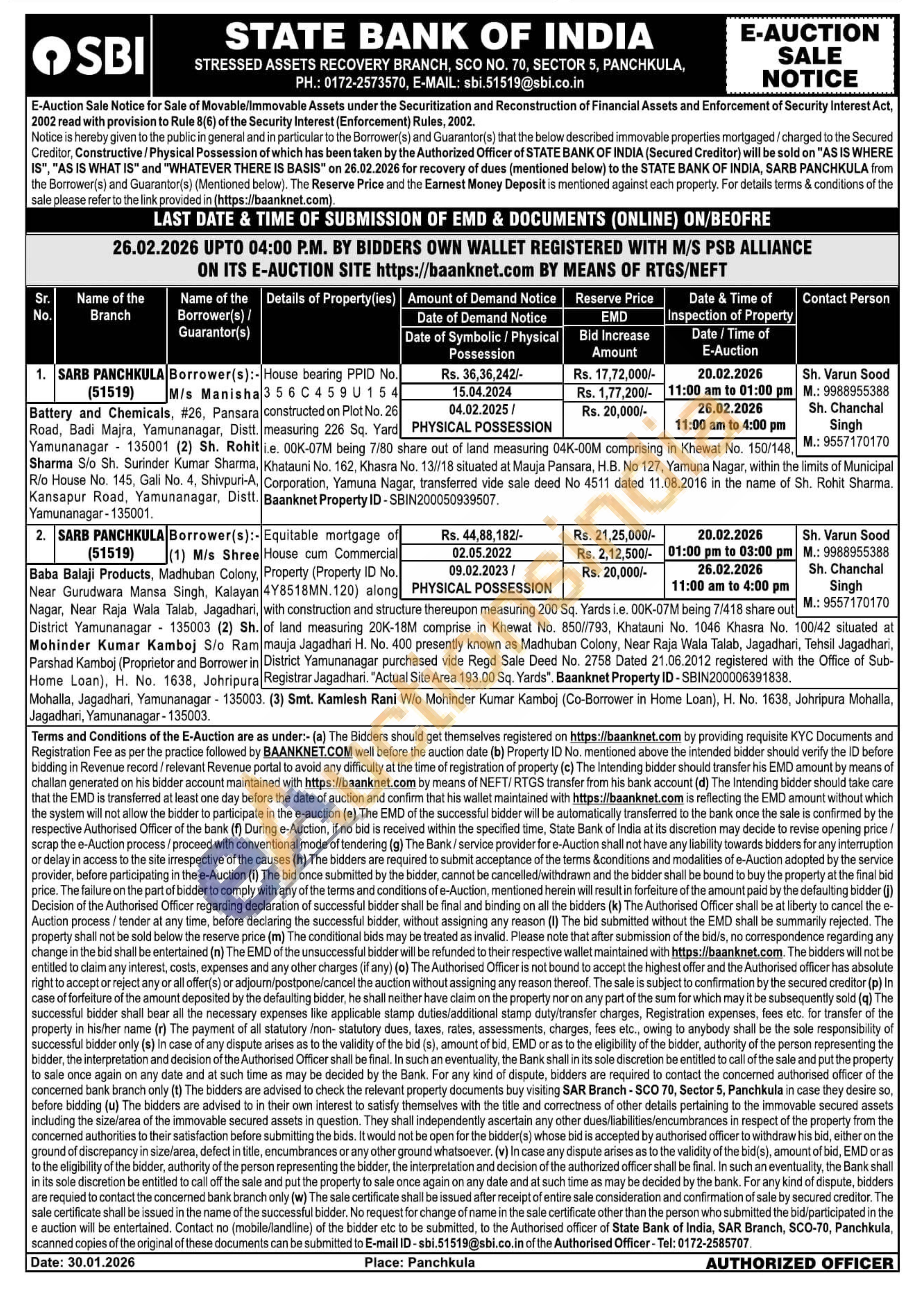 Equitable mortgage of House cum Commercial Property (Property ID No. 4Y8518MN.120) along with construction and structure thereupon measuring 200 Sq. Yards i.e. 00K-07M being 7/418 share out of land measuring 20K-18M comprise in Khewat No. 850//793, Khatauni No. 1046 Khasra No. 100/42 situated at mauja Jagadhari H. No. 400 presently known as Madhuban Colony, Near Raja Wala Talab, Jagadhari, Tehsil Jagadhari, District Yamunanagar purchased vide Regd Sale Deed No. 2758 Dated 21.06.2012 registered with the Office of Sub-Registrar Jagadhari. "Actual Site Area 193.00 Sq. Yards". Baanknet Property ID - SBIN200006391838