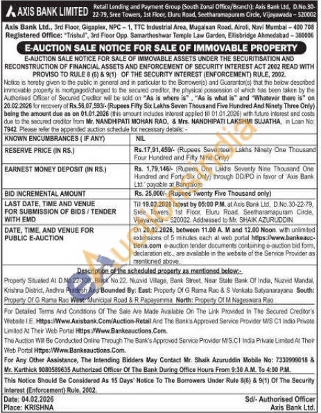 Property Siluated At D.No 22-108. Block No.22. Nuzvid Vitage, Bank Street. Near Stale Bank Of India, Nuzvid Mandal, Kristina District, Andhra Pradesh And Bounded By: East: Property Of G Rama Rao & S Venkata Satyanarayana South: Property Of G Rama Rao West: Municipal Road & R Papayamma North: Property Of M Nageswara Rao