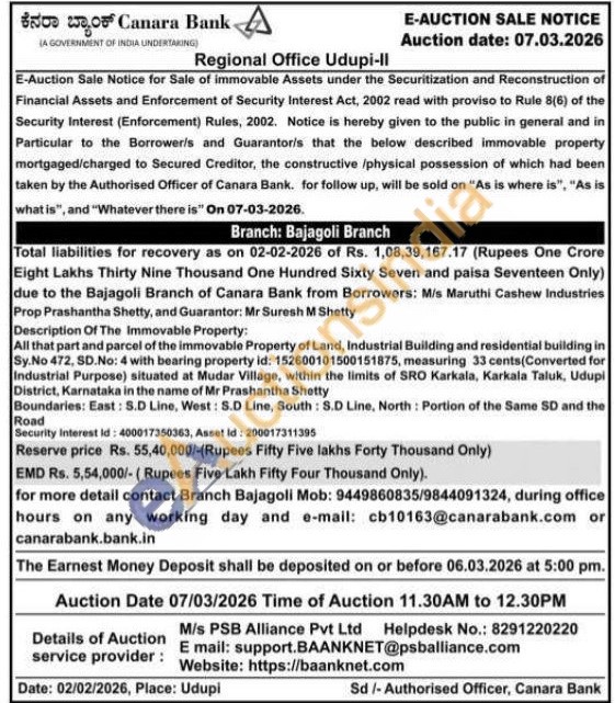 All that part and parcel of the immovable Property of Land, Industrial Building and residential building in Sy.No 472, SD.No: 4 with bearing property id: 152600101500151875, measuring 33 cents(Converted for Industrial Purpose) situated at Mudar Village, within the limits of SRO Karkala, Karkala Taluk, Udupi District, Karnataka in the name of Mr Prashantha Shetty