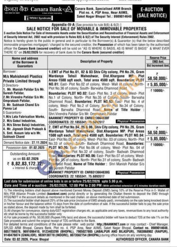 1.EMT of Plot No.01, 02 & 03 Shiv City colony, PH No.26, Gram Mardanya Tehsil Maheshwar, Dist. Khargone MP. Plot Areas-1500 sqft each, Total area 4500 sqft. Boundaries: PLOT NO.01: East- Plot No.02 of colony, West- Wall of colony, North-Plot No.36 of colony, South- Barwaha Dhamnod Road Boundaries: PLOT NO.02: East-Plot No. 3 of colony, West-Plot No.1 of Colony, North Plot No.35 of Colony, South- Barwaha Dhamnod Road, Boundaries: PLOT NO.03: East- Plot No. 4 of colony, West- Plot No.2 of Colony, North- Plot No.34 of Colony, South Barwaha Dhamnod Road, Name of Title Holder: Shri. Virendra Patidar S/o Mr. Omprakash Patidar BAANKNET PROPERTY ID: CNRB313664830F COORDINATES: 22.1855341, 75.6893517