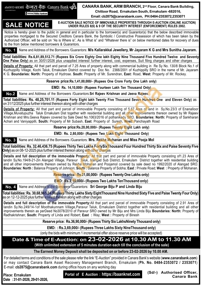 Details and full description of the immovable Property: All that part and parcel of immovable Property consisting of 2.91 Ares of landin Sy.No.249/14-1of Moothakunnam Village, Paravur Taluk, Ernakulam District together with residential building and all other improvements therein as perDeed No3078/2010 of Paravur SRO owned by Mr Biju and Mrs Linda Biju Boundaries: North: Property of Radhakrishnan; South: Property of Linda and Robert, East Way: West: Property of Binesh