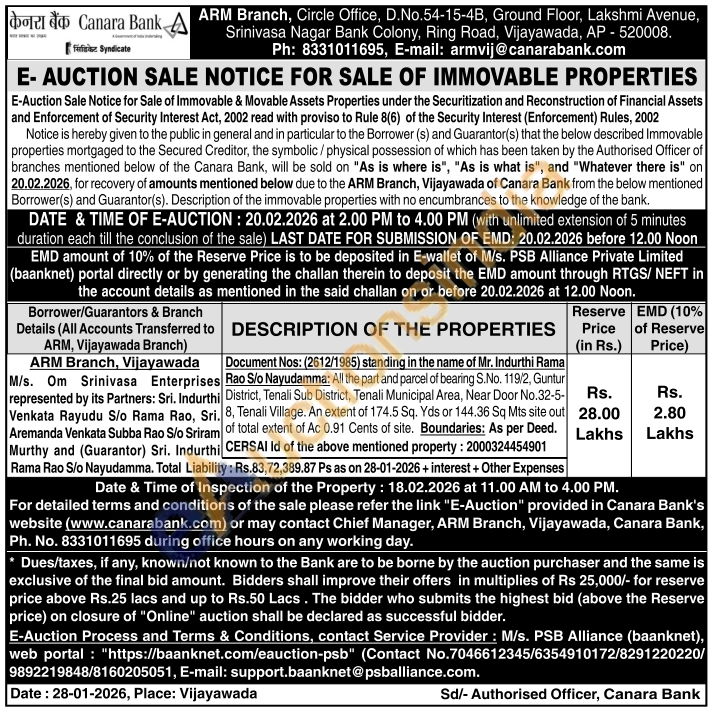 Document Nos: (2612/1985) standing in the name of Mr. Indurthi Rama Rao S/o Nayudamma: All the part and parcel of bearing S.No. 119/2, Guntur District, Tenali Sub District, Tenali Municipal Area, Near Door No.32-5-8, Tenali Village. An extent of 174.5 Sq. Yds or 144.36 Sq Mts site out of total extent of Ac 0.91 Cents of site. Boundaries: As per Deed. CERSAI Id of the above mentioned property: 2000324454901