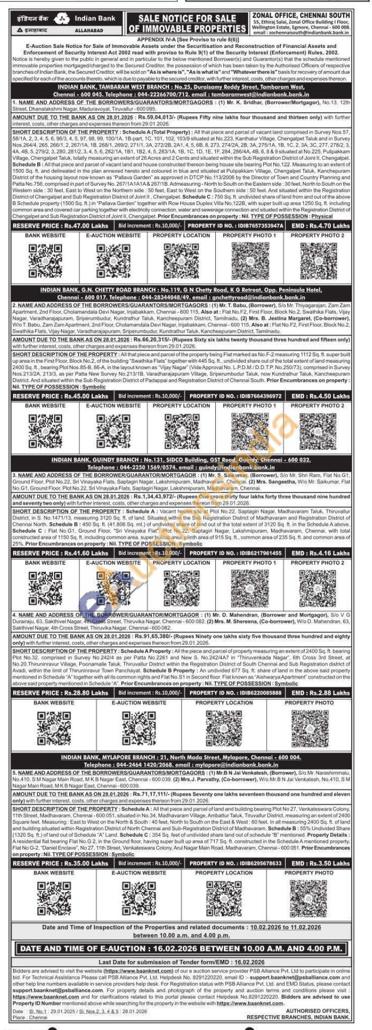 4) All the piece and parcel of property measuring an extent of 2400 Sq. ft. bearing Plot No.32, comprised in Survey No.242/4 as per Patta No.2261 and New S. No.242/4A7 in "Thiruvenkada Nagar, 6th Cross 3rd Street, al No. 20, Thiruninravur Village, Poonamalle Taluk, Thiruvallur District within the Registration District of South Chennai and Sub Registration district of Avadi, within the limit of Thiruninravur Town Panchayat. Schedule B Property: An undivided 677 Sq. ft. share of land in the above said property mentioned in Schedule "A" together with all its common rights and Flat No.S1 in Second floor. Flat known as "Aishwarya Apartment" constructed on the above said property mentioned in Schedule "A". Prior Encumbrances on property: NIL TYPE OF POSSESSION: Symbolic