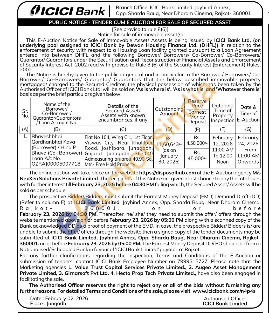 Flat No 104, Wing C 1, 1st Floor,Viswas City, Near Khalilpur Road, Joshipara, Junagadh, Gujarat, Junagadh -362140 Admeasuring an area 40.90 Sq. Mtr.- Free Hold Property