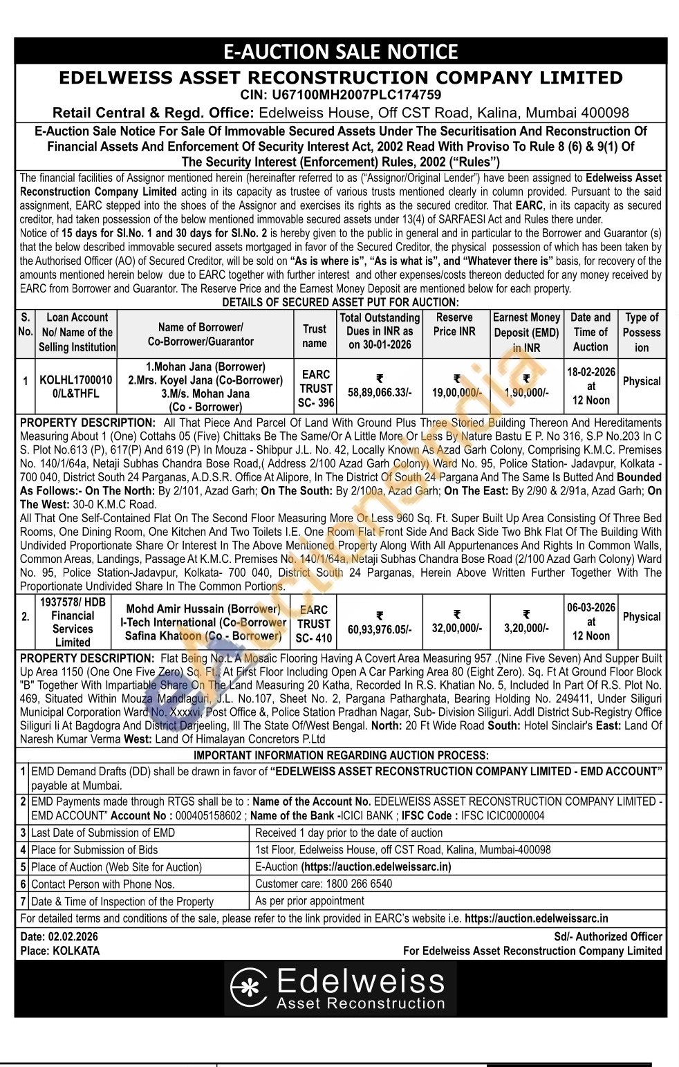 PROPERTY DESCRIPTION: All That Piece And Parcel Of Land With Ground Plus Three Storied Building Thereon And Hereditaments Measuring About 1 (One) Cottahs 05 (Five) Chittaks Be The Same/Or A Little More Or Less By Nature Bastu E P. No 316, S.P No.203 In C S. Plot No.613 (P), 617(P) And 619 (P) In Mouza - Shibpur J.L. No. 42, Locally Known As Azad Garh Colony, Comprising K.M.C. Premises No. 140/1/64a, Netaji Subhas Chandra Bose Road. (Address 2/100 Azad Garh Colony) Ward No. 95, Police Station- Jadavpur, Kolkata -700 040, District South 24 Parganas, A.D.S.R. Office At Alipore, In The District Of South 24 Pargana And The Same Is Butted And Bounded As Follows:- On The North: By 2/101, Azad Garh; On The South: By 2/100a, Azad Garh; On The East: By 2/90 & 2/91a, Azad Garh: On The West: 30-0 K.M.C Road. All That One Self-Contained Flat On The Second Floor Measuring More Or Less 960 Sq. Ft. Super Built Up Area Consisting Of Three Bed Rooms, One Dining Room, One Kitchen And Two Toilets I.E. One Room Flat Front Side And Back Side Two Bhk Flat Of The Building With Undivided Proportionate Share Or Interest In The Above Mentioned Property Along With All Appurtenances And Rights In Common Walls, Common Areas, Landings, Passage At K.M.C. Premises No. 140/1/64a, Netaji Subhas Chandra Bose Road (2/100 Azad Garh Colony) Ward No. 95, Police Station-Jadavpur, Kolkata- 700 040, District South 24 Parganas, Herein Above Written Further Together With The Proportionate Undivided Share In The Common Portions.