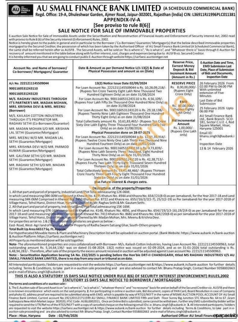 1. All that part and parcel of property, Industrial Land/Plot Total admeasuring 12K-06M. In which Land measuring ORK-00M comprised in Khewat No. 4235 Khatuni No. 4944 and Khasra No. 654//21(B-0) as per Jamabandi, for the Year 2017-18 and Land measuring 04K-06M Comprised in Khewat No. 7453 Khatuni No. 8722 and Khasra no. 655//16/2/2(1-7), 25/1(2-19) as Per Jamabandi for the year 2017-2018 of Village Hansi, Tehsil Hansi, District Hisar, Haryana. Owned By Mr. Raghav Sethi & Mr. Gautam Sethi 2. All that part and parcel of property, Industrial Land/Plot Total admeasuring 15K-16M. In which Land measuring 07K-16M comprised in Khewat no. 4148, Khatuni No. 4856, and Khasra No. 654//19/1(3-16),19/2(4-0) as per Jamabandi for the year 2017-18 and Land measuring 08K-00M Comprised in Khewat No. 7413 Khatuni No. 8682 and Khasra No. 654//20(8-0) as per Jamabandi for the year 2017-2018 of Village Hansi, Tehsil Hansi, District Hisar, Haryana. Owned by Mr. Madan Mohan, Mrs. Meenu & Krishna Devi. For properties serial no. 1 & 2 the combined boundaries are given as below:- East-Road, West-Agri land of Ramji Lal, North-Property of Radha Swami Satsang Ghar, South-Others property Total Built Up Area 66517 Sq. Ft. Approx.