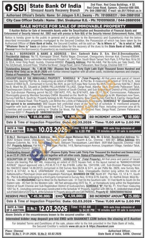 DESCRIPTION OF THE IMMOVABLE PROPERTY: SCHEDULE "A" (Total Property): All that piece and parcel of Vacant House site bearing Plot No. 148, measuring an extent of 2372 Square Feet, in the layout named as "NAMACHIVAYAM AVENUE (layout approved vide L.PD.M./D.T.C.P. No.316/99, Letter No. 13412/99, LA2, Sub-Division Planning Permit No. 194/2012 dated 14.09.2012) comprised in Old Survey Nos 56/24 & 57/1, as per Patta No. 2829, new Survey Nos. 56/13 & 57/1A2, in No.4, URAPAKKAM VILLAGE, Vandalur Taluk, Chengalpattu District lying within the limits of Kattankulathur Panchayat Union and Urapakkam Panchayat, BOUNDED ON THE: North BY: Plot Nos. 13, 12 & 11, South By: Plot & Building belonging to a third party Comprised in Survey Nos. 57/8 & 57/9, East By: Dr. Karthik Street, West By Plot No. 14A MEASURING East to West On the Northern side: 51 Feet On the Southern side: 51 Feet North to South On the Eastern side: 45 Feet On the Western side: 48 Feet admeasuring 2372 Sq. Ft, or thereabouts lying within the Registration District of South Chennai and Sub-Registration District of Guduvanchery, SCHEDULE "B": Flat No. F1, First Floor measuring 1267 Sq. ft., (including common area) constructed in the Schedule 'A' Properly, together with 385 Sq. ft., Undivided share of land out of total Extent of 2372 Sq. ft., of the Schedule "A" Property along with one CAR PARKING. Property ID: SBIN200059766344