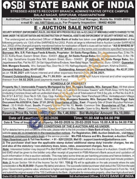 SCHEDULE OF PROPERTY : Property No.1: Immovable Property Mortgaged by Smt. Mungara Suseela, Wio. Sanyasi Rao: All that piece and parcel of the Residential Flat No.403, 4th Floor, in "Lakshmi Srinivasa Towers" with Plinth Area 1070 Sq. Feet (including Common Area) with an undivided share of 46 sq.yds out of Total extent of 704.6 Sq.yds, in Plot No.9 in R.S. No.873/1 & 873/2, Door No.8-126, Opp. Opp. Kanaka Durga Temple, Near Panchayat Office, Venkatapuram Village & Panchayat, Eluru, Eluru District. Belonging to Smt. Mungara Suseela, Wio. Sanyasi Rao (Vide Regd. Sale Document No.635/2014, Date: 27.01.2014). Boundaries of Site: East: Property Site of Shaik Muzubur Rehman, West: 33 ft Width Road, South: Property Site in Plot No. 10, North: Common Site. Boundaries of Flat: East: Open to Sky, West: Common Corridor, Steps and Open to Sky, South: Open to Sky, North: Open to Sky