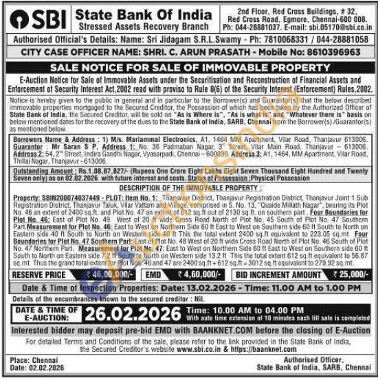 Property: SBIN200074037449-PLOT: Item No. 1: Thanjavur District, Thanjavur Registration District, Thanjavur Joint 1 Sub Registration District, Thanjavur Taluk, Vilar Vattam and Village, comprised in S. No. 13, "Quaide Millath Nagar, bearing its Plot No. 46 an extent of 2400 sq.ft. and Plot No. 47 an extent of 612 sq.ft out of 2130 sq.ft. on southern part. Four Boundaries for Plot No. 46; East of Plot No. 49 West of 20 ft wide Cross Road North of Plot No. 45 South of Plot No. 47 Southern Part Measurement for Plat No. 46: East to West on Northern Side 60 ft East to West on Southern side 60 ft South to North on Eastern side 40 ft South to North on Western side 40 ft This the total extent 2400 sq ft equivalent to 223.05 sq.mt Four Boundaries for Plot No. 47 Southern Part: East of Plot No. 48 West of 20 ft wide Cross Road North of Plot No. 46 South of Plot No. 47 Northern Part. Measurement for Plot No. 47. East to West on Northern Side 60 ft East to West on Southern side 60 ft South to North on Eastern side 7.2 ft South to North on Western side 13.2 ft. This the total extent 612 sq.ft equivalent to 56.87 sq.mt. Thus the grand total extent for Plot Nos. 46 and 47 are 2400 sq.ft+612 sq.ft-3012 sq.ft equivalent to 279.92 sq.mt