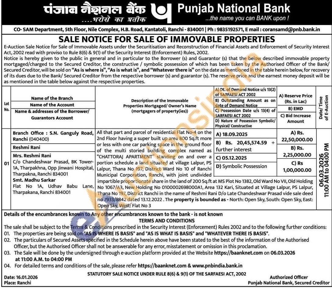 All that part and parcel of residential Flat No-4 on the 2nd Floor having a super built up area 800 Sq.ft more or less with one car parking space in the ground floor of the multi storied building complex named as CHATTORAJ APARTMENT" standing on and over a portion schedule a land situated at village Lalpur, PS Lalpur, Thana No 197, District Ward No 10 of Ranchi Municipal Corporation, Ranchi, with joint undivided impartible proportionate share in the land of 200 Sq.ft at MS Plot No 1382, Old Ward No VII, Old Holding No 1067/A3, New Holding No 0100002698000A1, Area 132 Kari, Situated at Village Lalpur, PS Lalpur, Thana No 197, District Ranchi in the name of Reshmi Rani D/o Late Chandeshwar Prasad vide sale deed no 7933/8842 dated 13.12.2022. The property is bounded as - North: Open Sky, South: Open Sky, East: Open Sky, West: Flat No 3