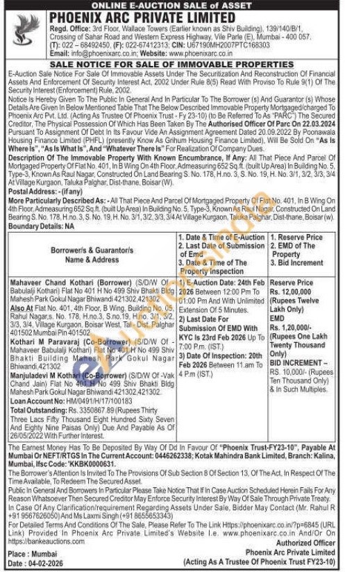 More Particularly Described As: All That Piece And Parcel Of Mortgaged Property Of Flat No. 401, In B Wing On 4th Floor, Admeasuring 652 Sq.ft. (built Up Area) In Building No. 5. Type-3, Known As Raul Nagar, Constructed On Land Bearing S. No. 178. Hло. 3.3. No. 19. Н. No. 3/1, 3/2, 3/3, 3/4 At Village Kurgaon, Taluka Palghar, Dist-thane, Boisar (w). Boundary Details: NA