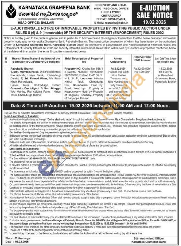 Branch Manager at Patrehally Branch Phone No : 9480023418 / Regional Office Authorized Officer Phone No : 9886410405