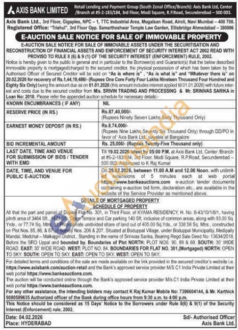 All that the part and parcel of Duplex Flat No. 301, in Third Floor, of KYAMA RESIDENCY, H. No. 8-43/10/1/8/1, having plinth area of 3464 St., 1423 8ft. Open Terrace and Car parking 140 Sft, inclusive of common areas, along with 93.00 Sq. Ynds, or 77.74 Sq. Mitrs, of Propotionats undivided share of land out of 406.00 Sq. Yids, or 338.58 50. Mrs, constructed on Plot Nos. 85, 86, & 87, in Survey Nos. 206 & 207, Situated at Boduppal Vilage, under Boduppal Muniopality. Medipally Mandal, Medchal-Malkajgiri District, Standing in the name of Srinivas Sarika, Bearing Regd Sale Deed No: 13634/2018, Before the SRO Uppal and bounded by. Boundaries of Plot NORTH: PLOT NOS 90, 89 & 88. SOUTH: 30 WIDE ROAD EAST: 30' WIDE ROAD WEST: PLOT NO. 84. BOUNDARIES FOR FLAT NO. 301, (Mortgaged) NORTH: OPEN TO SKY SOUTH: OPEN TO SKY EAST: OPEN TO SKY. WEST: OPEN TO SKY