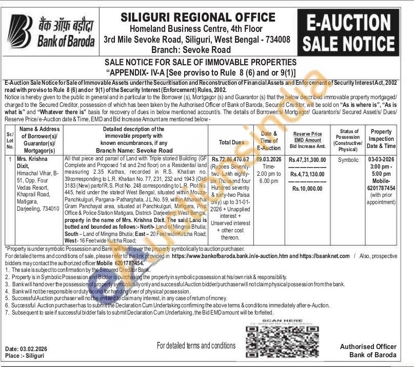 All that piece and parcel of Land with Triple storied Building (GF Complete and Proposed 1st and 2nd floor) on a Residential land measuring 2.35 Kathas, recorded in R.S. Khatian no. 39 corresponding to L.R. Khatian No. 77, 231, 232 and 1943 (Old) 3183 (New) partof R.S. Plot No. 248 corresponding to L.R. Plot No. 445, held under the state of West Bengal, situated within Mouza-Panchkulguri, Pargana-Patharghata, J.L.No. 59, within Atharakhal Gram Panchayat area, situated at Panchkulguri, Matigara, Post Office & Police Station Matigara, District- Darjeeling, West Bengal, property in the name of Mrs. Krishna Dixit. The said Land is butted and bounded as follows:- North- Land of Mingma Bhutia; South-Land of Mingma Bhutia; East-20 FeetwideKutcha Road, West-16 Feet wide Kutcha Road;