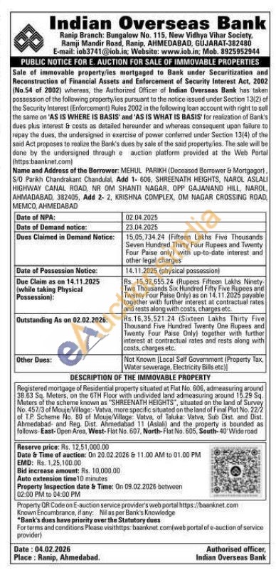 Registered mortgage of Residential property situated at Flat No. 606, admeasuring around 38.63 Sq. Meters, on the 6TH Floor with undivided land admeasuring around 15.29 Sq. Meters of the scheme known as "SHREENATH HEIGHTS", situated on the land of Survey No. 457/3 of Mouje/Village:-Vatva, more specific situated on the land of Final Plot No. 22/2 of T.P. Scheme No. 80 of Mouje/Village: Vatva, of Taluka: Vatva, Sub Dist, and Dist. Ahmedabad and Reg. Dist. Ahmedabad 11 (Aslali) and the property is bounded as follows-East-Open Area, West-Flat No. 607, North-Flat No. 605, South-40' Wide road