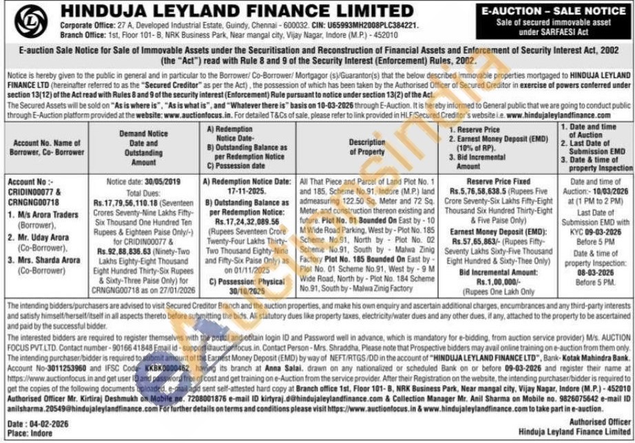 Authorised Officer Mr. Kirtiraj Deshmukh on Mobile no : 7208001876 / Collection Manager Mr. Anil Sharma on Mobile no : 9826075642