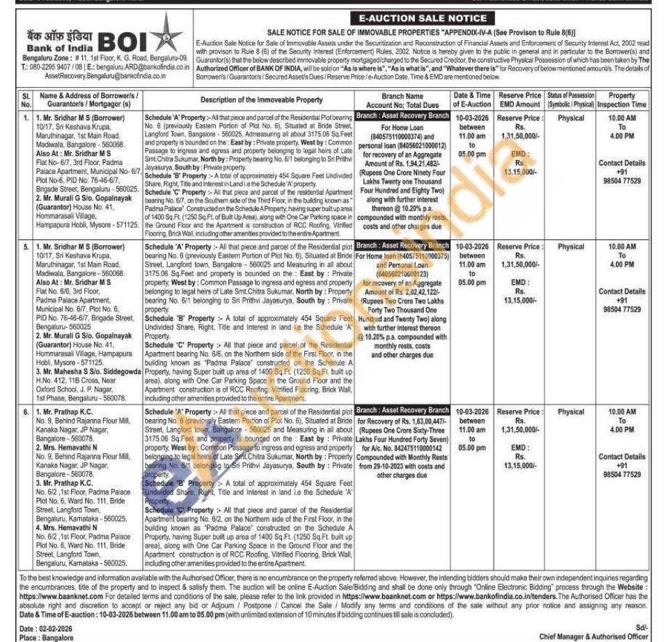 Schedule 'A' Property :- All that piece and parcel of the Residential Plot bearing No. 6 (previously Eastern Portion of Plot No. 6). Situated at Bride Street, Langford Town, Bangalore - 560025, Admeasuring all about 3175.06 Sq. Feet and property is bounded on the East by: Private property, West by: Common Passage to ingress and egress and property belonging to legal heirs of Late Smt. Chitra Sukumar, North by: Property bearing No. 61 belonging to Sri Prithvi Jayasurya, South by: Private property Schedule 'B' Property:- A total of approximately 454 Square Feet Undivided Share, Right, Title and Interest in Land ie the Schedule 'A' property. Schedule "C" Property: All that piece and parcel of the residential Apartment beanng No. 6/7, on the Southem side of the Third Floor, in the building known as Padma Palace Constructed on the Schedule A Property, having super built up ansa of 1400 Sq. Ft. (1250 Sq. Ft, of Built Up Area), along with One Car Parking space in the Ground Floor and the Apartment is construction of RCC Roofing, Vitrified Flooring, Brick Wall, including other amenities provided to the entire Apartment
