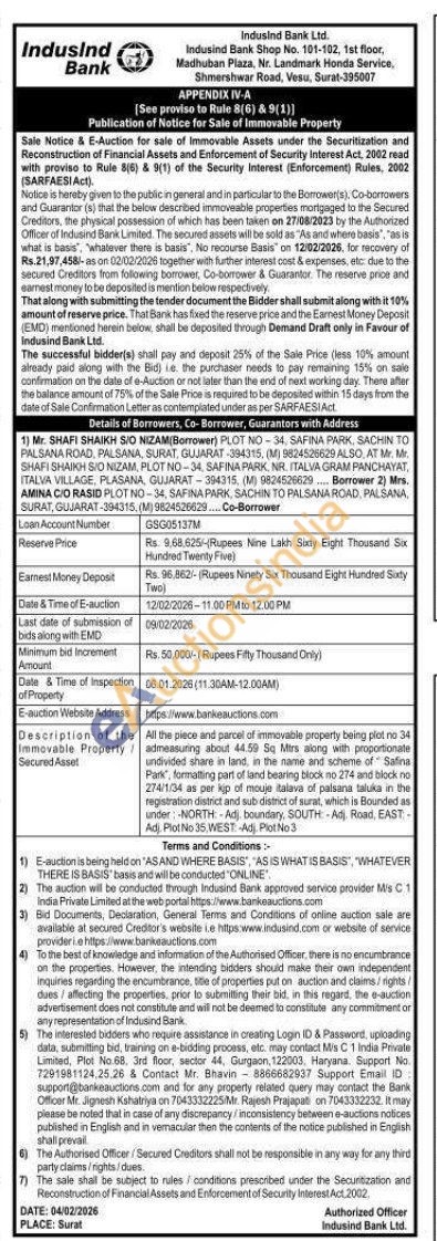 All the piece and parcel of immovable property being plot no 34 admeasuring about 44.59 Sq Mirs along with proportionate undivided share in land, in the name and scheme of Safna Park", formatting part of land bearing block no 274 and block no 274/1/34 as per kip of mouje talava of palsana taluka in the registration district and sub district of surat, which is Bounded as under-NORTH-Adj, boundary, SOUTH A Road, EAST Adi. Plot No 35 WEST Adi Plot No3