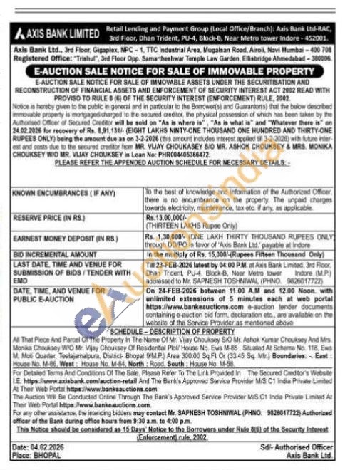 All That Piece And Parcel Of The Property in The Name Of Mr. Vijay Chouksey S/O Mr. Ashok Kumar Chouksey And Mrs. Monika Chouksey W/O Mr. Vijay Chouksey Of Residential Plot House No. Ews M-85, Situated At Scheme No. 118, Ees M. Mod Quarter, Teelajamalpura, District- Bhopal /MP.) Area 300.00 Sq Ft Or (33.45 Sq. Mr Boundaries: East: House No. M-86, West House No. M-64, North Road, South House No. M-58.