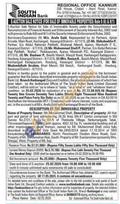 Name of Property Owner: Mr. Muhammed Shali, Description of property: All that part and parcel of land admeasuring 34.20 Ares (84.47 Cents) comprised in Old Survey No.2721, Re.Sy.No.101/5 of Thekkada Village. Nedumangadu Taluk Thiruvananthapuram District with approx. 4931.52 Sq. Ft. residential building and all other improvements made thereon, owned by Mr. Muhammed Shafi more fully described in Registered Sale Deed No.2450/2014 dated 17.10.2014 of SRO Kanyakulangara. BOUNDARIES: North: Panchayath Thadam (Now Road), East: Property of Mr. Sundareshan Nair, South: Property of Mr. Sundareshan (presently Mirs. Sheeja), West: Property of Mr. Saji.