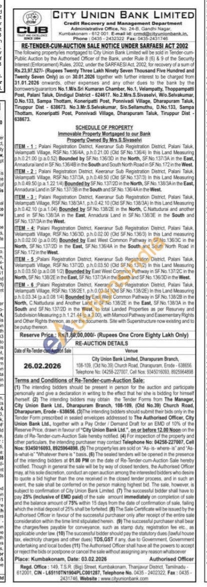 ITEM 1: Palani Registration District, Keeranur Sub Registration District, Palani Taluk Velampatti Village, RSF.No. 1364A, ph.0.21.00 (Old SFNo. 13614) In this Land Measuring ph.0.21.00 (pa.0.52) Bounded by SFNo.13630 in the North, SF No. 137/3A in the East, Annadural land in SF.No 136/48 in the South and South North Road in SF.No. 172 in the West. ITEM-2: Palani Registration District, Keeranur Sub Registration District, Palani Taluk, Velampatti Vilage, RSF.No 137/3A, ph0:49.50 (Old SF.No. 137/3) in this Land Measuring ph0.49.50 (pa 1.22 1/4) Bounded by SF.No 137:20 in the North, SF No. 138/3A in the East, Annadural Land in SF.No. 137/38 in the South and SF No. 136/4Ain the West ITEM 3 Palani Registration District, Keeranur Sub Registration District, Palani Taluk Velampatti Village, RSF.No. 138/3A1, p.h.0.42.10 (Old SF.No. 138/3A) in this Land Measuring ph0.42.10 (pa 1.04) Bounded by SF No. 138/2E in the North, C.Nattudurai and another Land in SF.No 138/3A in the East, Annadurai Land in SF.No.138:3E in the South and SF.No. 1373A in the West W De le ITEM-4: Palani Registration District, Keeranur Sub Registration District, Palani Taluk Velampatti Village, RSF.No. 13630. ph.0.02.00 (Old SF.No.136/3) in this Land measuring ph.0.02.00 (pa0.05) Bounded by East West Common Pathway in SF No.136/30 in the North, SF No.137/20 in the East, SF.No.136/4A in the South and South North Road in SF.No 172 in the West ITEM 5 Palani Registration District, Keeranur Sub Registration District, Palani Taluk, Vetampatti Vitage, RSFNo 137/20, p.h.0.03.50 (Old SF.No. 137:2) in this Land Measuring p.h.0.03.50 (pa0.08 1/2) Bounded by East West Common Pathway in SF.No. 137/2C in the North, SF.No. 138/2E in the East, SF.No. 137/3A in the South and SFNo. 136/3D in the West. 1) nt ITEM-6 Palani Registration District, Keeranur Sub Registration District, Palani Taluk Velampatti Village, RSF.No. 138/2E1, p.h.0.03.34 (Old SF.No. 138/26) in this Land Measuring ph.0.03.34 (pa 008 1/4) Bounded by East West Common Pathway in SF.No. 138/28 in the North, C. Nattudurai and Another Land in SF No 138/2E in the East, SF.No. 138/3A in the South and SF No. 137/20 in the West. In total Landed Properties as per Resurvey and Subdivision Measuring ph.1.21.44 (pa.3.00), with Mamool Pathway and Easementary Rights and Other Rights thereon, as per the documents. Site with Superstructure now existing and to be putup thereon