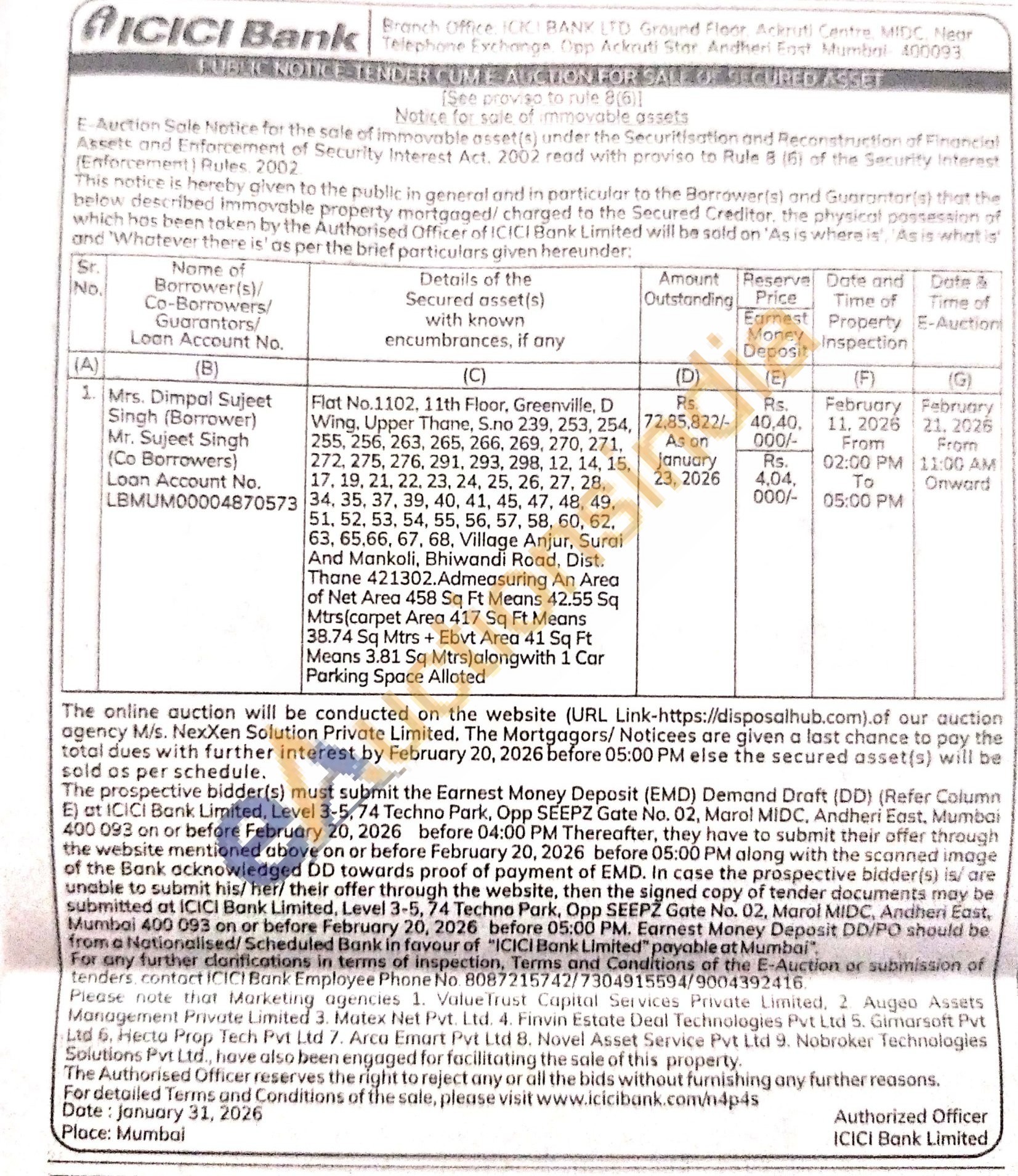 Flat No.1102, 11th Floor, Greenville, D Wing. Upper Thane, S.no 239, 253, 254, 255, 256, 263, 265, 266, 269, 270, 271, 272, 275, 276, 291, 293, 298, 12, 14, 15, 17, 19, 21, 22, 23, 24, 25, 26, 27, 28, 34, 35, 37, 39, 40, 41, 45, 47, 48, 49, 51, 52, 53, 54, 55, 56, 57, 58, 60, 62, 63, 65,66, 67, 68, Village Anjur, Surai And Mankoli, Bhiwandi Road, Dist. Thane 421302.Admeasuring An Area of Net Area 458 Sq Ft Means 42.55 Sq Mtrs(carpet Area 417 Sq Ft Means 38.74 Sq Mtrs + Ebvt Area 41 Sq Ft Means 3.81 Sq Mtrs)alongwith 1 Car Parking Space Alloted
